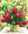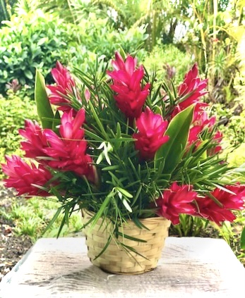 CONTENT: 16 Ginger flowers in a natural woven basket. & dark-green Podocarpus foliage - arranged in flower foam, in a natural woven basket. - stands about 12" tall